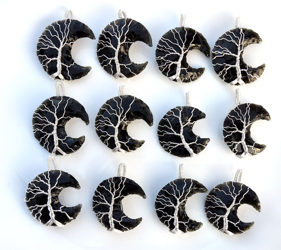 Most Trending Children's Handmade Black Obsidian Crescent Moon Shape Healing Pendant Necklace Wholesale Silver Plated Wire