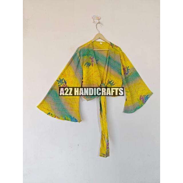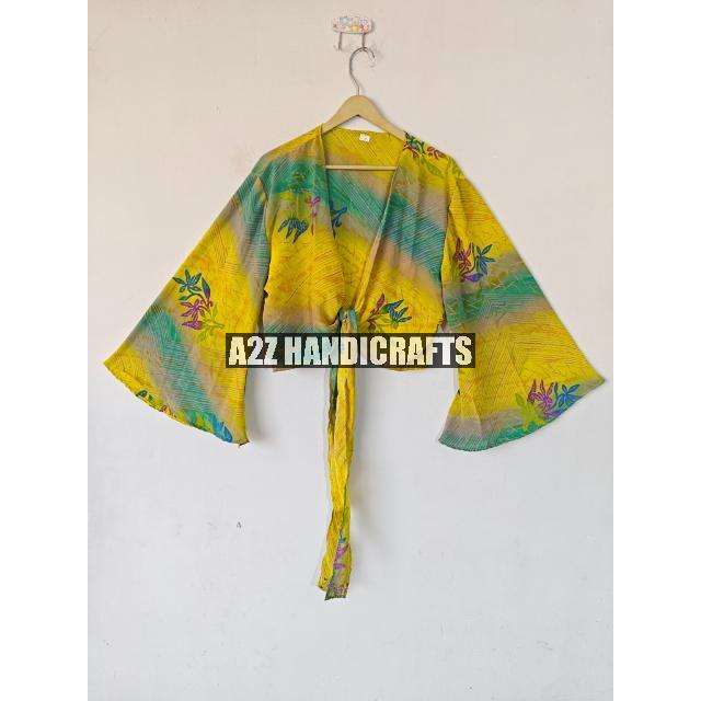 Most Trending Women's Floral and Dot Pattern Silk Wrap Tie Top Long Bell Sleeve Casual Crop Top with Deep V for Summer Parties