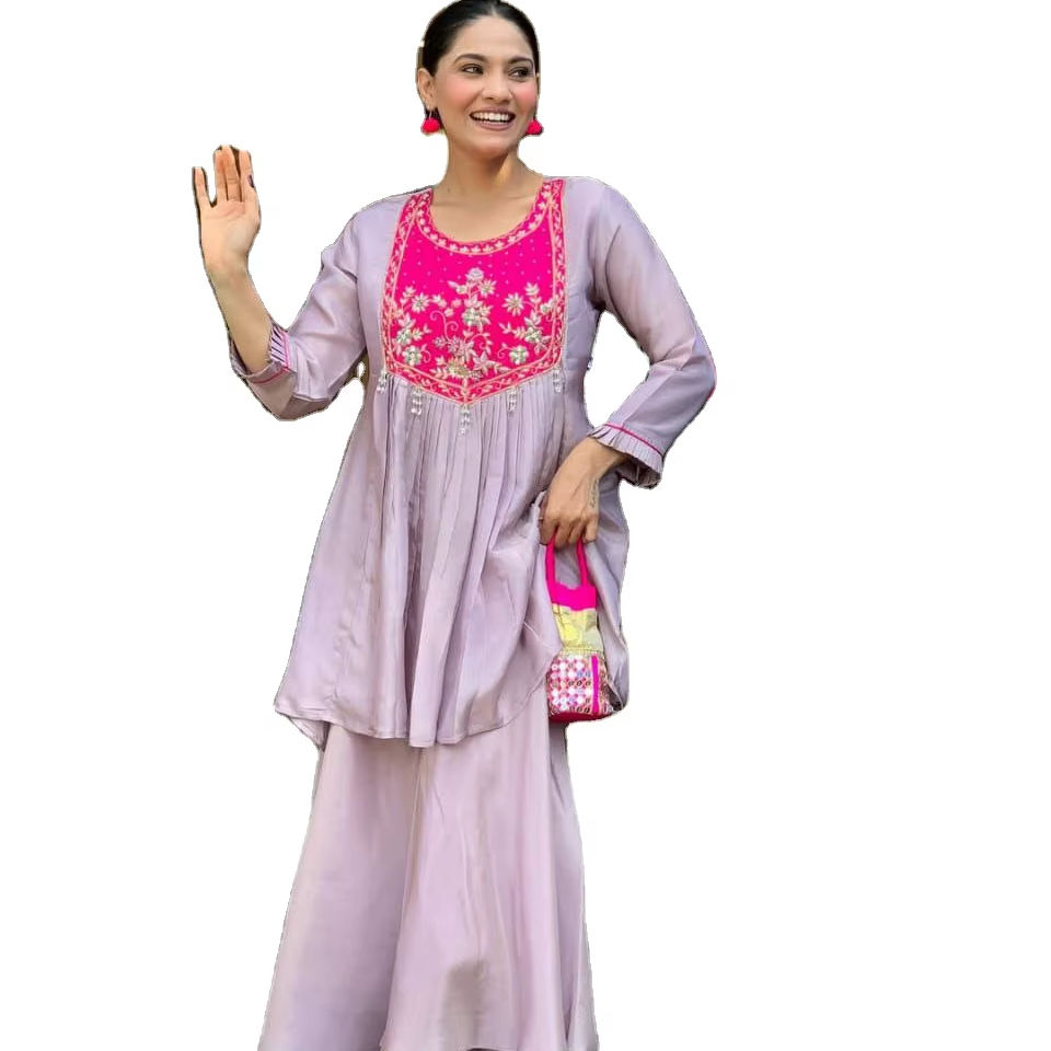 Trendy Lavender Silk O Neck Fancy Kurti & Bottom Set Hand Embroidery Latkans for Women Bride Party Occasion Reasonable Price