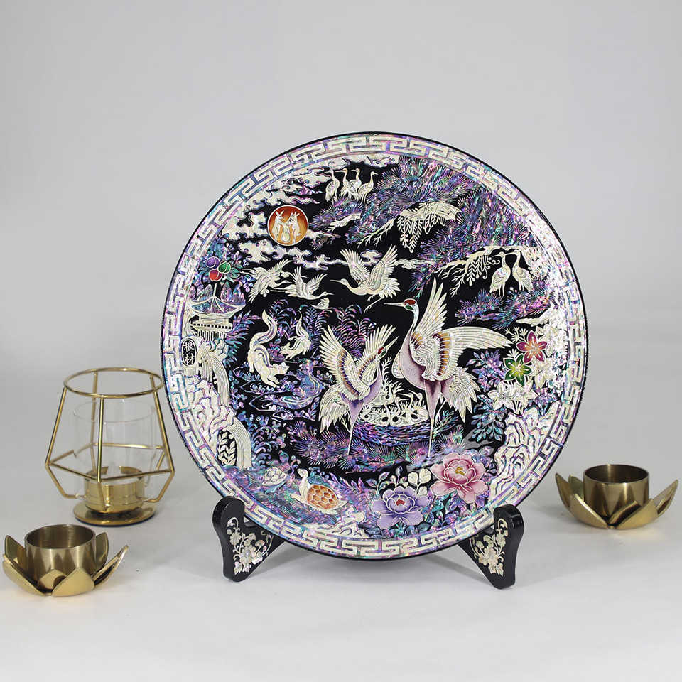 Mother of Pearl Decorative Tray with Songhak Crane & Moon Elegant Asian Inspired Design