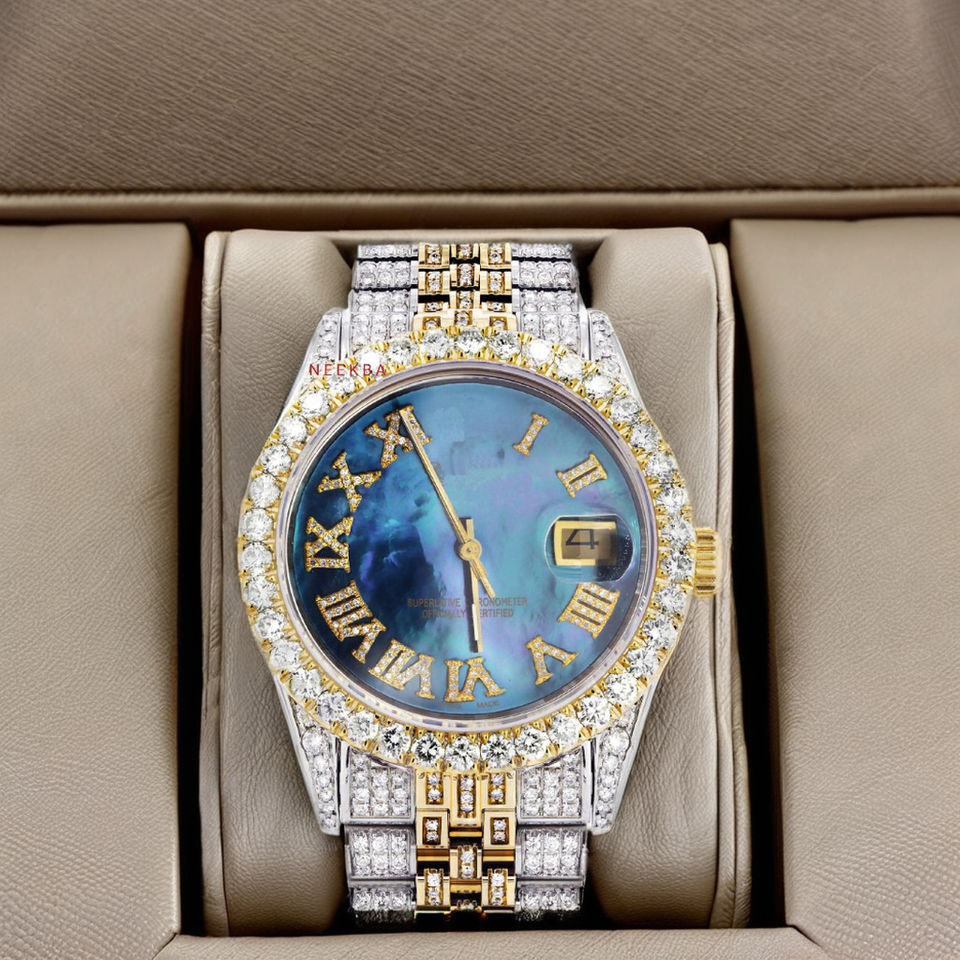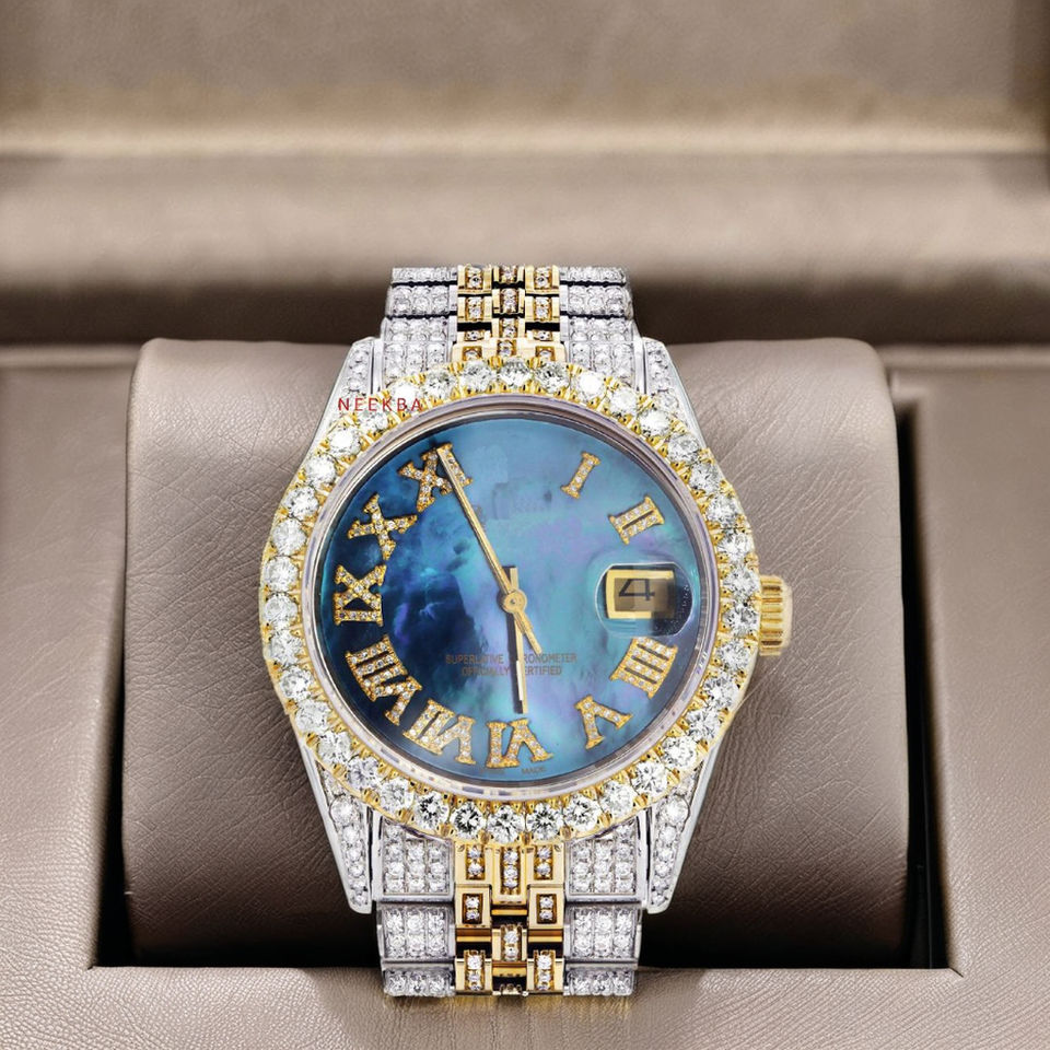 Mother of Pearl Dial Moissanite Watch - High-End Bling Wristwatch, Entirely Hand-Set Moissanite Analog Watch by Indian Supplier