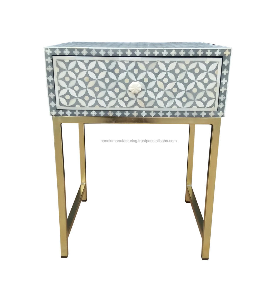 Mother of Pearl Furniture Bone Inlay 1 Drawer Bedside Table Black Geometric Style From India