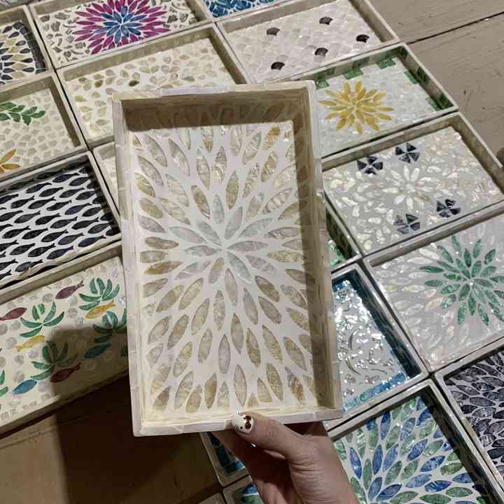 Mother of Pearl Inlay Rattan Tray MOP Shell Inlaid Woven Plate Tropical Style Serving Bowl, Natural Nacre Inlay Tray Wholesale