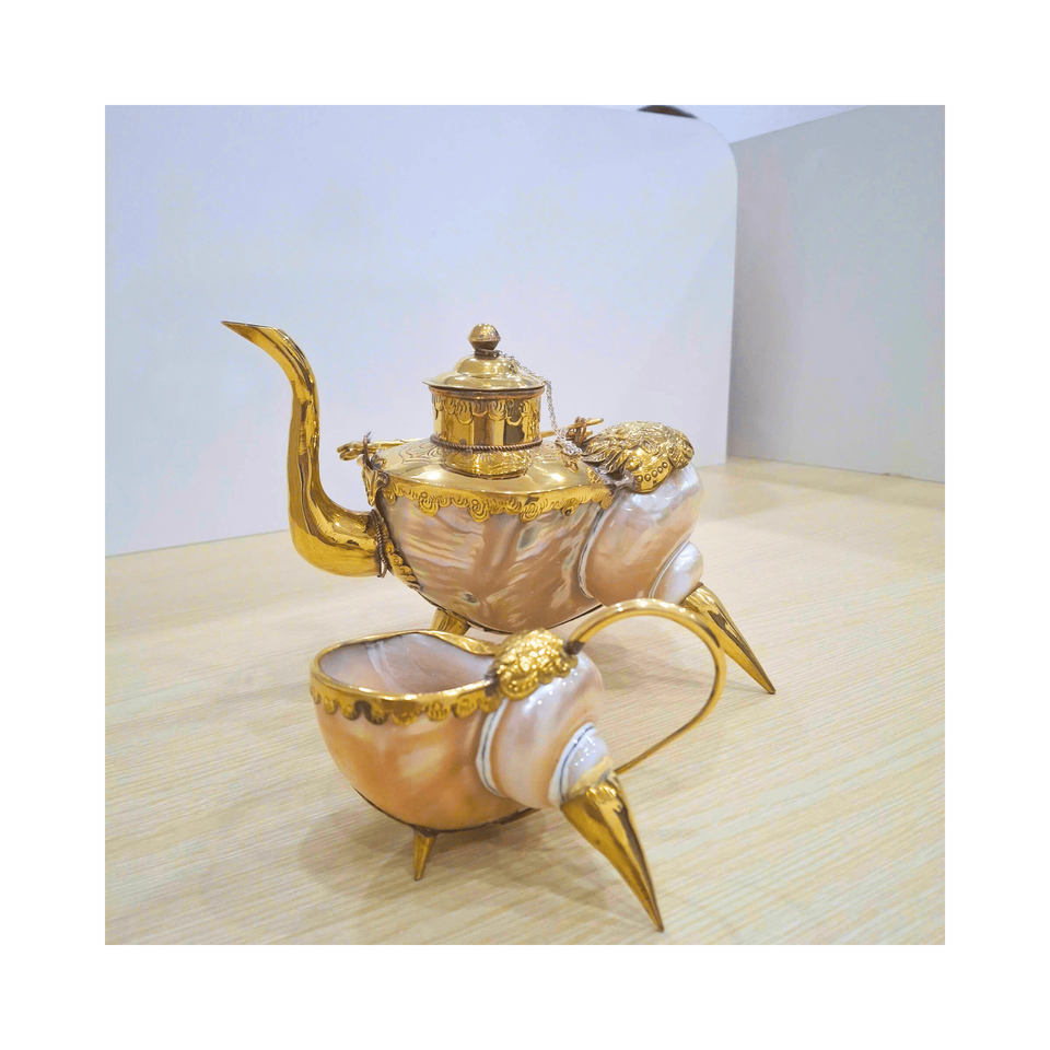 Mother of Pearl and Shell Metal Teapot and Cup Set Handmade Luxury Eco-Friendly Tea Set for Resorts and Home Decor