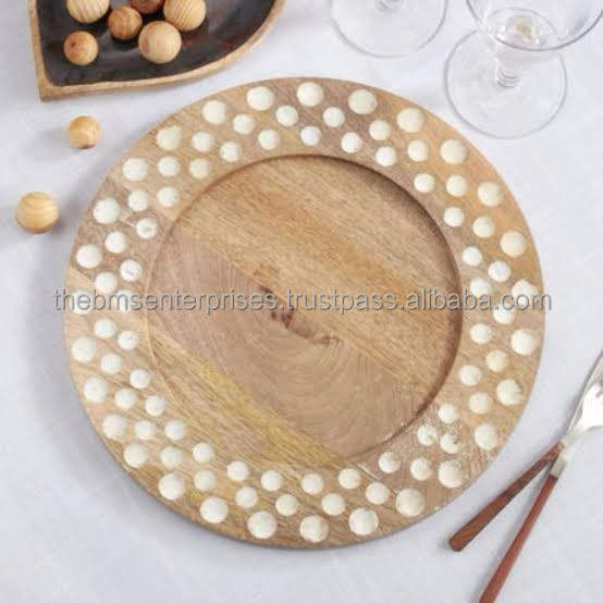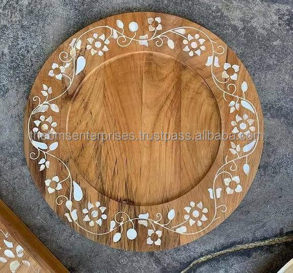 Eco-Friendly Mother Pearl Inlay Engraved Acacia Wood Round Charger Plate Classic Style Food Safe Dinnerware for Presents