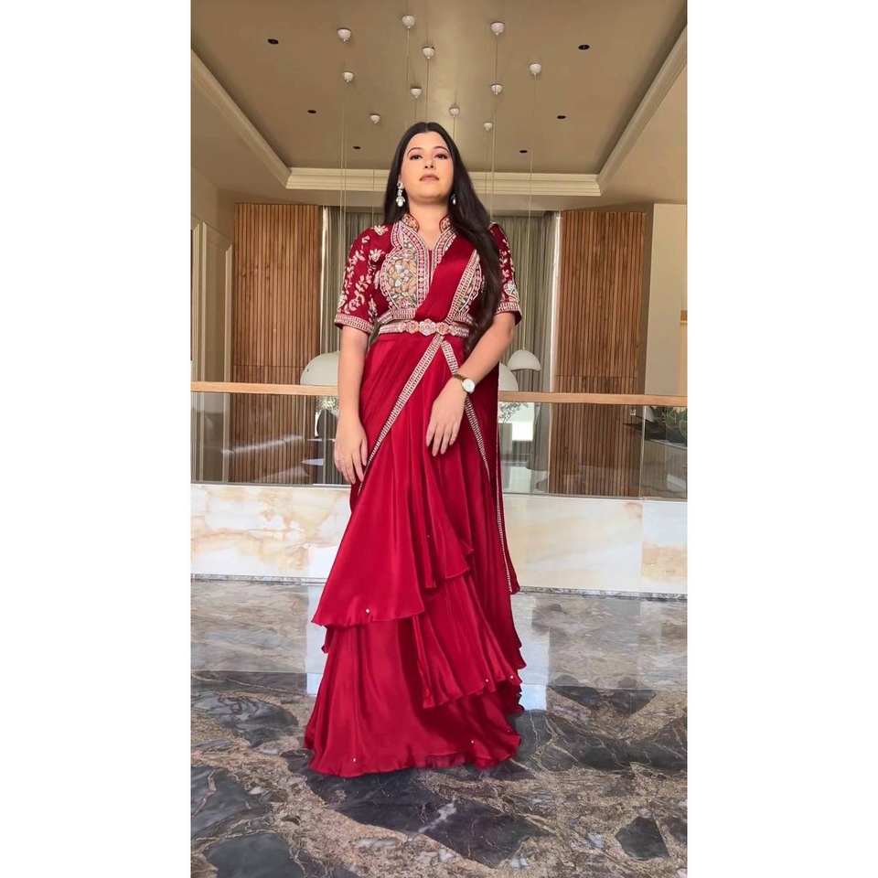 Moti Work Embellished Party Wear Lehenga Saree Elegant Prom Dresses Look