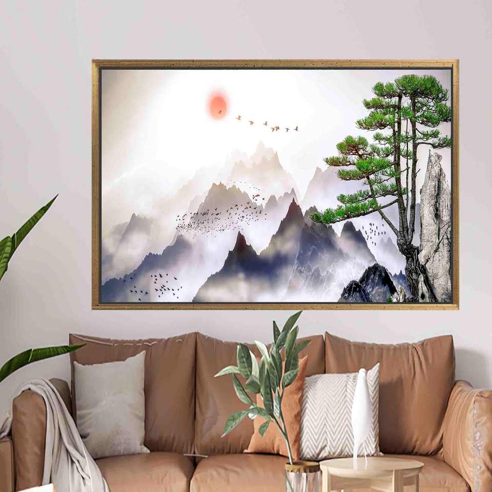 Mountain View Canvas Print: Elegant Bohemian Japanese Landscape Artwork,1P:Gold Framed