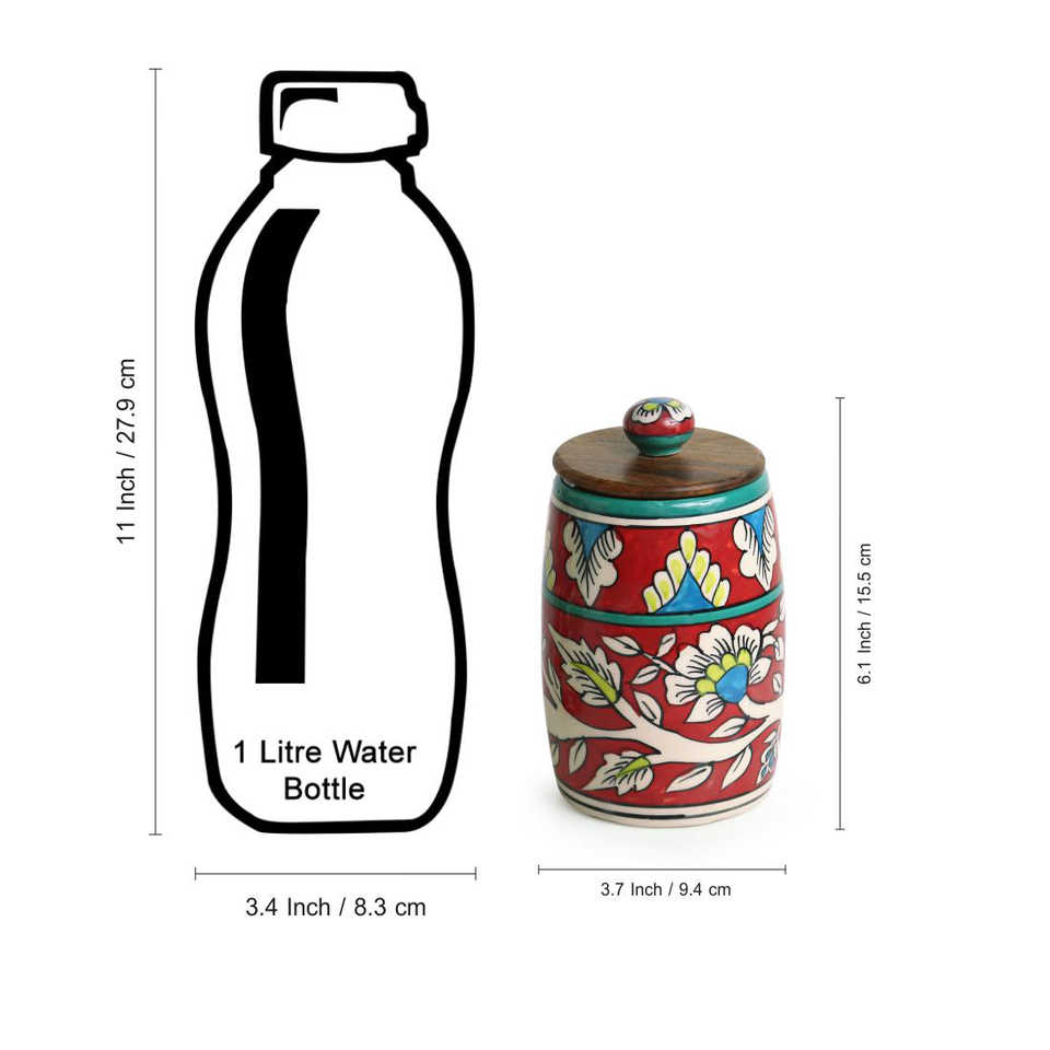 Mughal Drum Duo Floral Hand-Painted Red & Brown Ceramic Storage Jars (Airtight) 570 ML 15.5 cm Multi Utility Set of 2