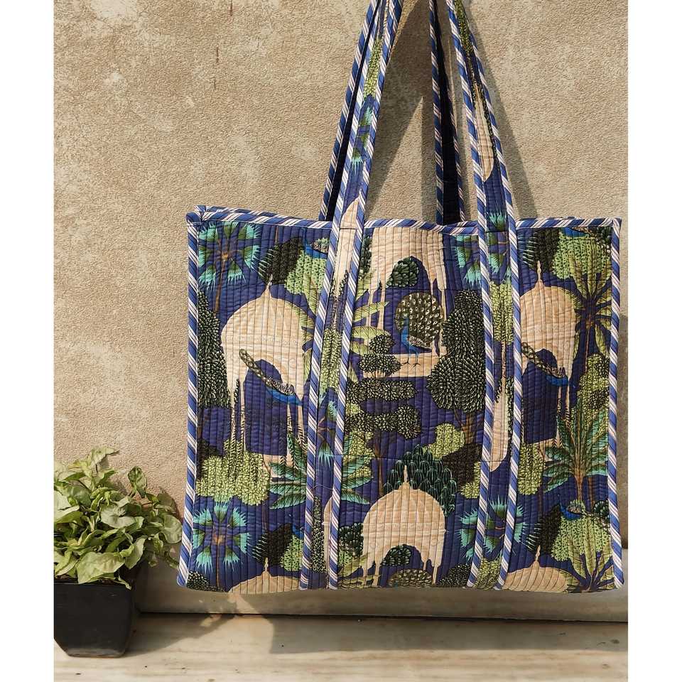 Mughal Garden Small Fashion Tote Handbag Blue Quilted Floral Decoration Daily Use Washable Reusable Eco-Friendly Cotton Lining