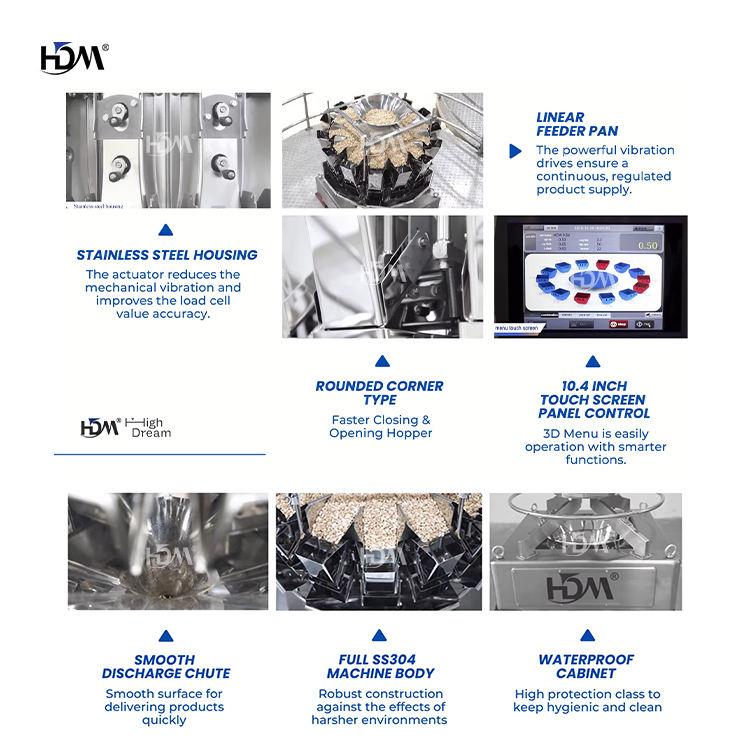 core components:Motor, PLC, 3D Menu, SS304 Step Motor Housing, 10.4" Color Touch Screen, USB 2.0 Port, Modular Design, Robust Square Body, Water Proof Cabinet, Top Cone, Infeed Funnel, Collection Bucket, Rounded Corner Hoppers, Plain Surface Hopper, Dimple Surface Hopper