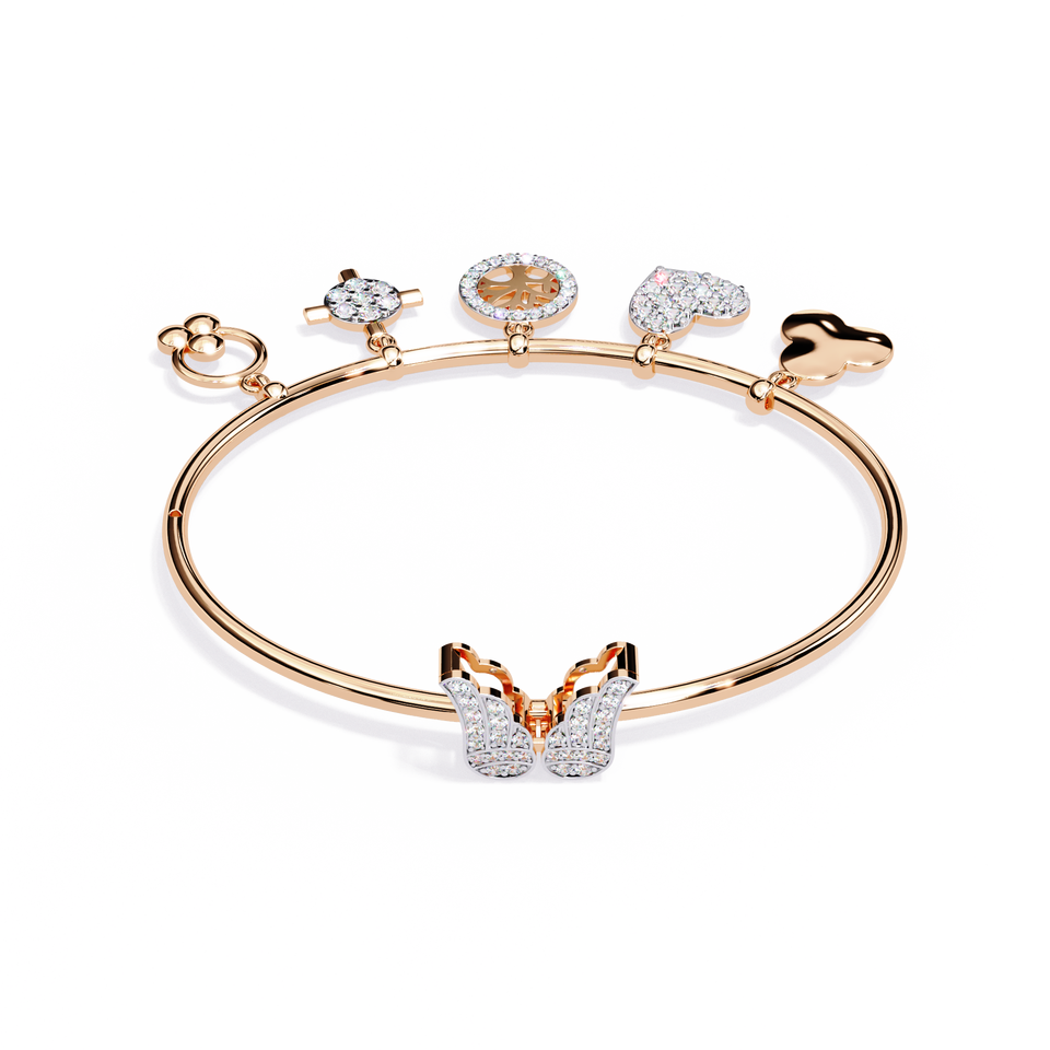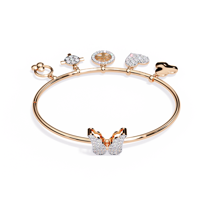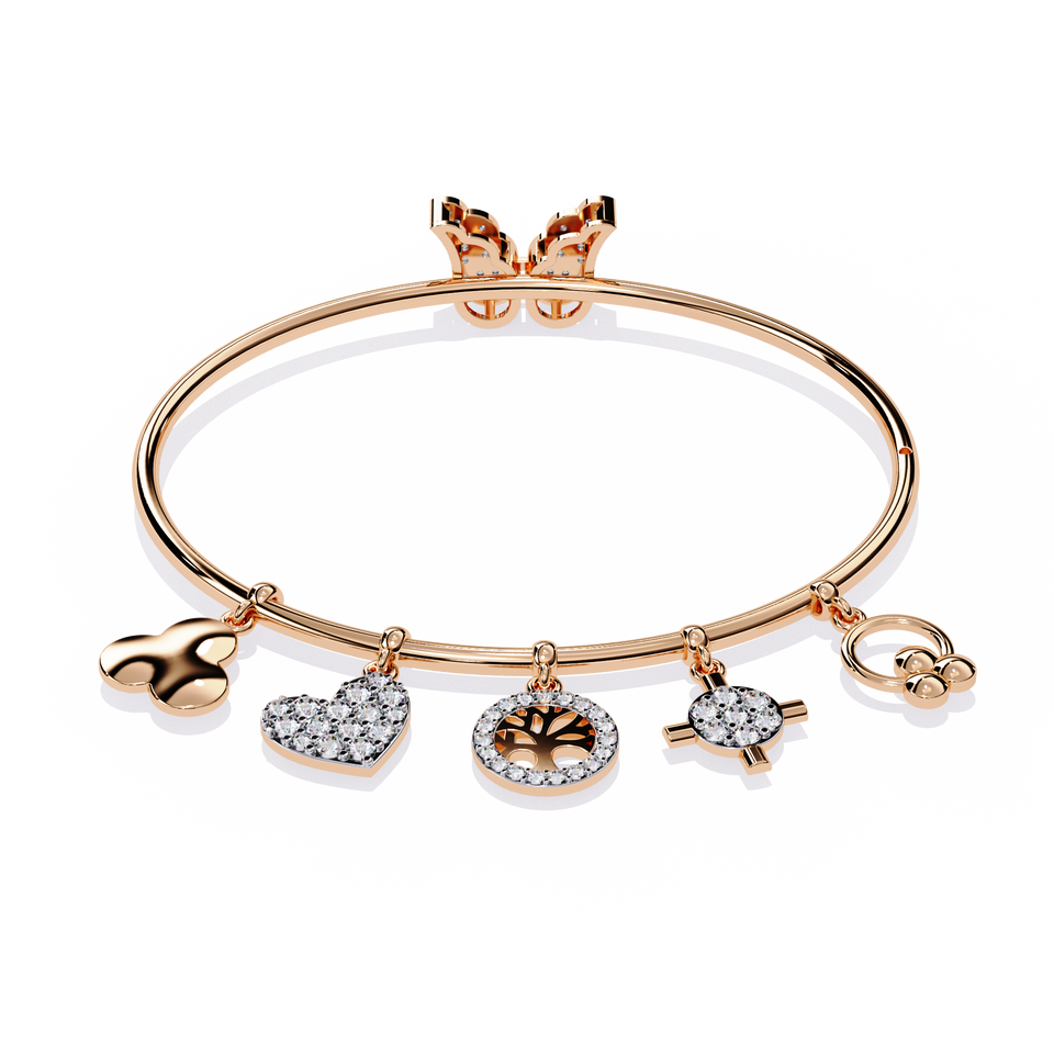 Multi Charm Diamond Bangle in Lab Grown 10kt 14K Rose Gold | Heart Tree of Life Cross Designer Pave Charm Diamond Women Jeweller