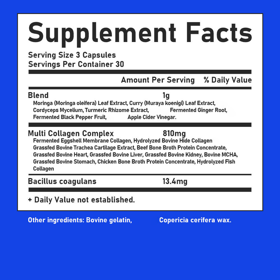 Main Ingredient:Multi Collagen Complex, Herbal Blend, Bacillus coagulans Probiotic
