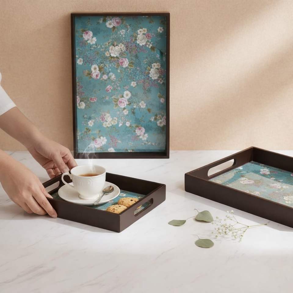 Multi Color Floral Design Square Trays with Handles for Serving Snacks for Home and Kitchen and Dinning Purpose Usage Available