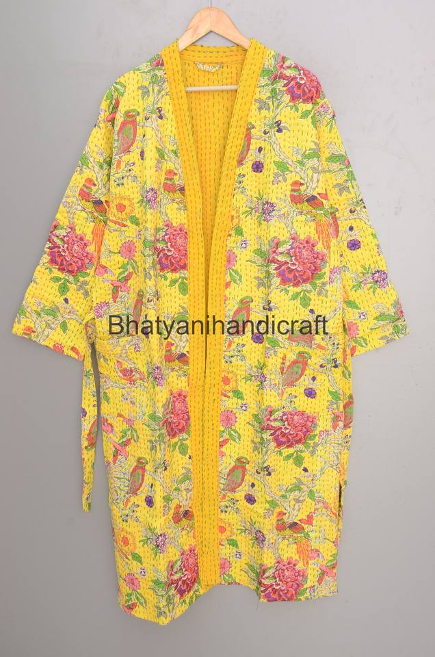 Handmade Women's Winter Cotton Kantha Robe with Multi-Color Floral Design Quilted Long House Robe with Belt Closure Jacket