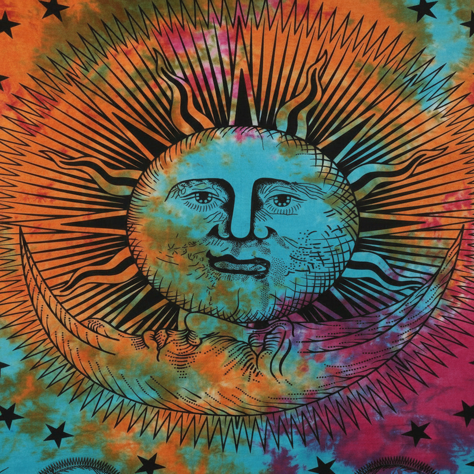 Multi-Color Sun Moon Floral Printed Beautiful Handmade Twin Size Tapestry Tie Dye Cotton Ethnic Home Decor By Indian Consigners
