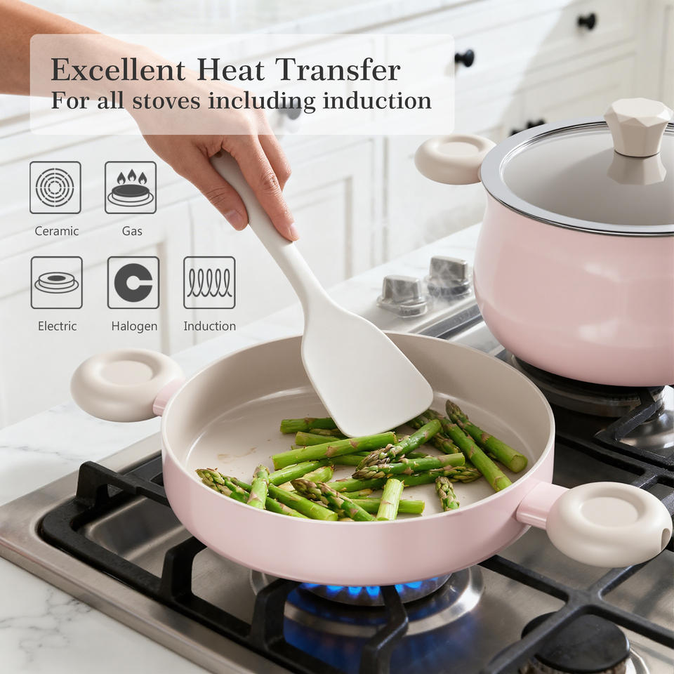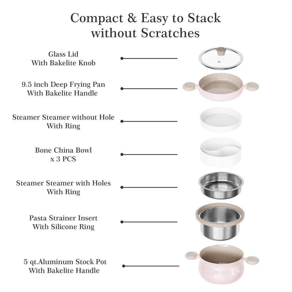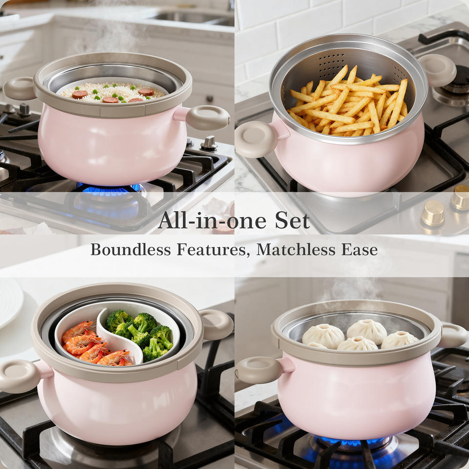 Multi-Functional Cookware Set Cream Color Frying Pan Steamer Pot With Handle Oven Safe Kitchen Set