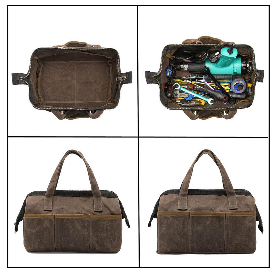 Multi Functional Customizable HIgh Quality Waxed Canvas Tool Tote 13" Grey Wide Mouth Organizer with Brass Zipper & 10 Pockets