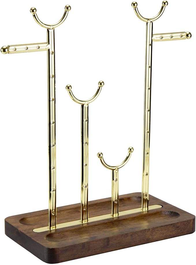 Multi-Level Brown Wood Brass Tone Metal Jewelry Stand Necklace Hanger Earring Storage Ring Tray for Efficient Organization