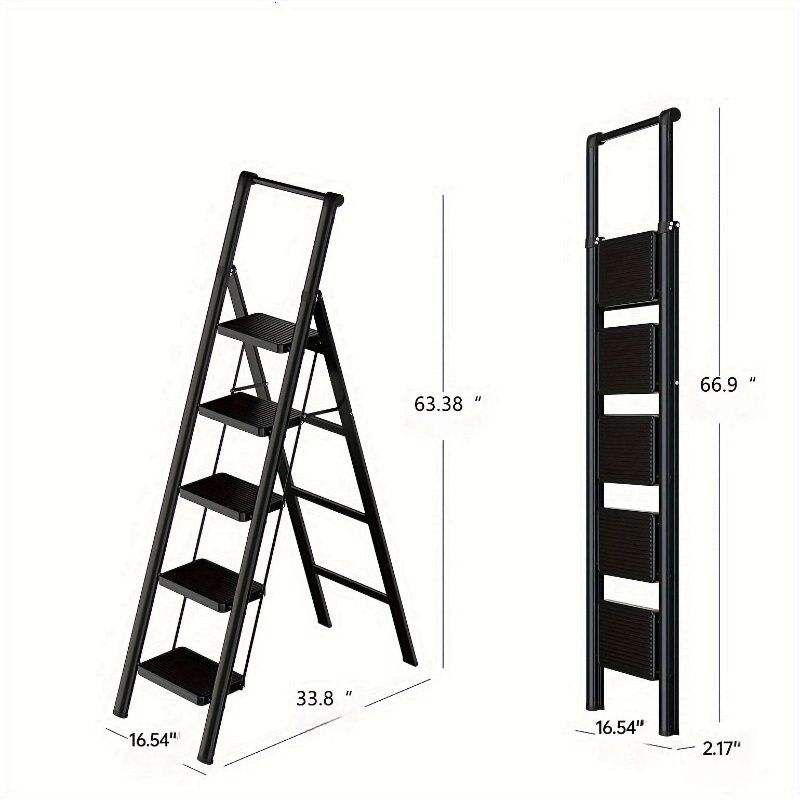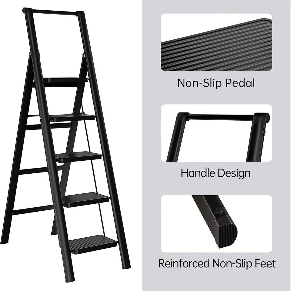 Multi-Purpose 5-Step Folding Steel Ladder with Anti-Slip Wide Pedals Lightweight Easy-Carry Handle for Home or Office Use