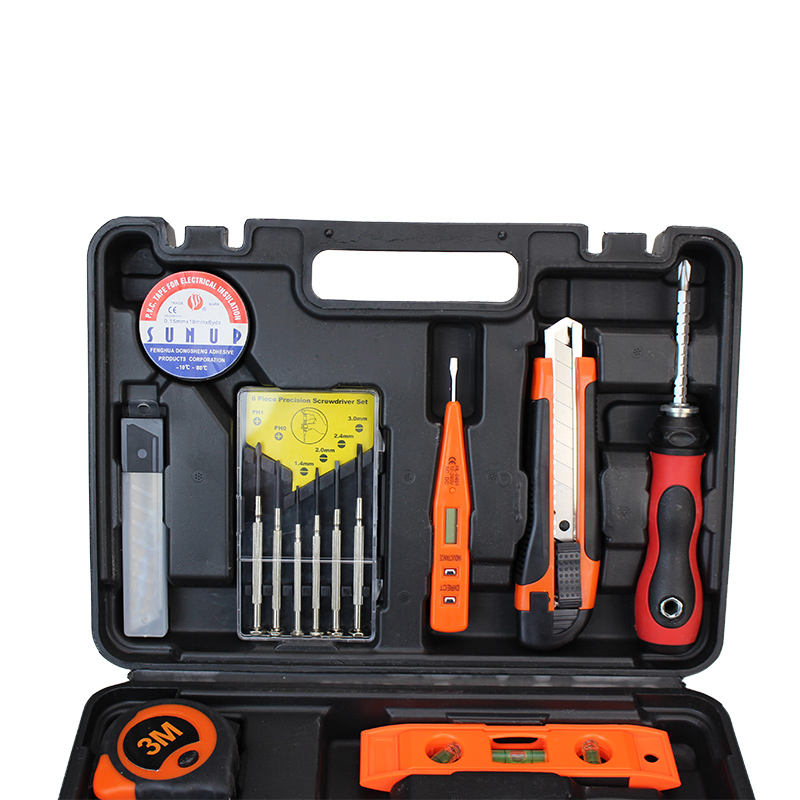 Long Nose, Claw Hammer, Spirit Level, Measuring Tape, Utility Knife, Blade, electroprobe, Precision Screwdriver, Insulating tape, Retractable Screwdriver, Blow molding boxtool includes