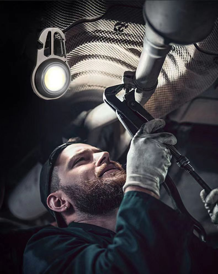 Multi function COB LED Carabiner Keychain Light USB Rechargeable Work Flashlight with Emergency Window Breaker Bottle Opener