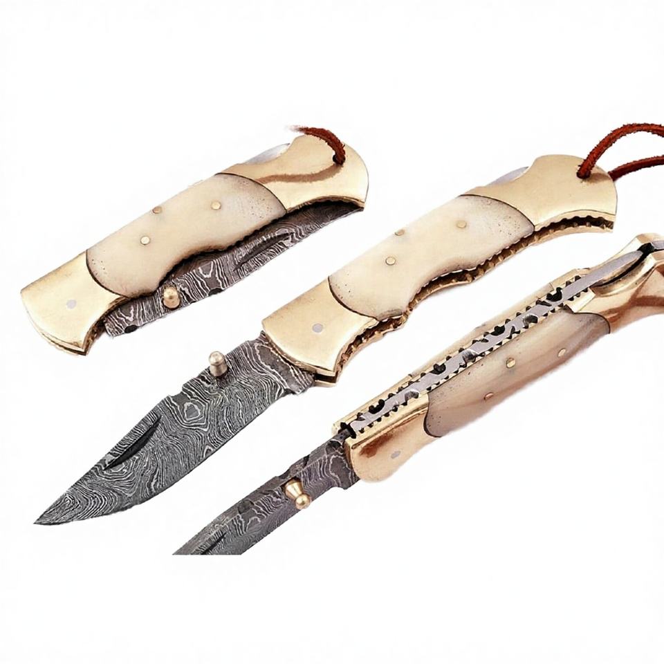 Multi-function Stainless Steel Folding Pocket Knife Camel Bone Brass Bolsters Handle OEM Made Hunting Knife Damascus Steel Blade
