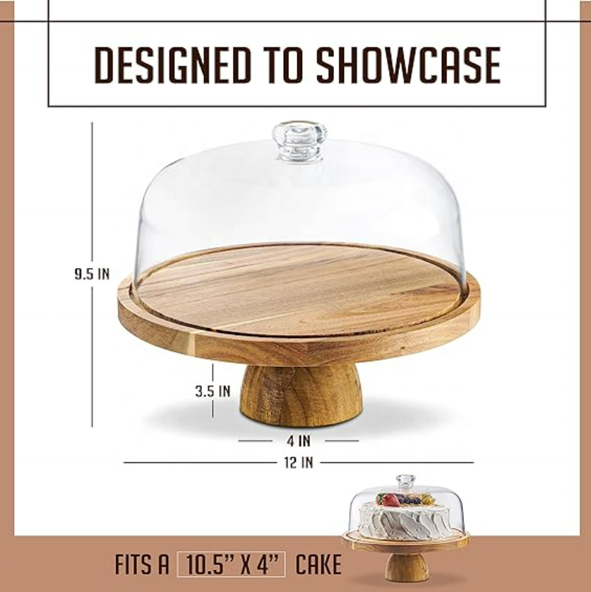 Multi-functional Acacia Wood Cake Stand With Glass Lid Bowl Pedestal Home Kitchen Decoration India Manufacturer