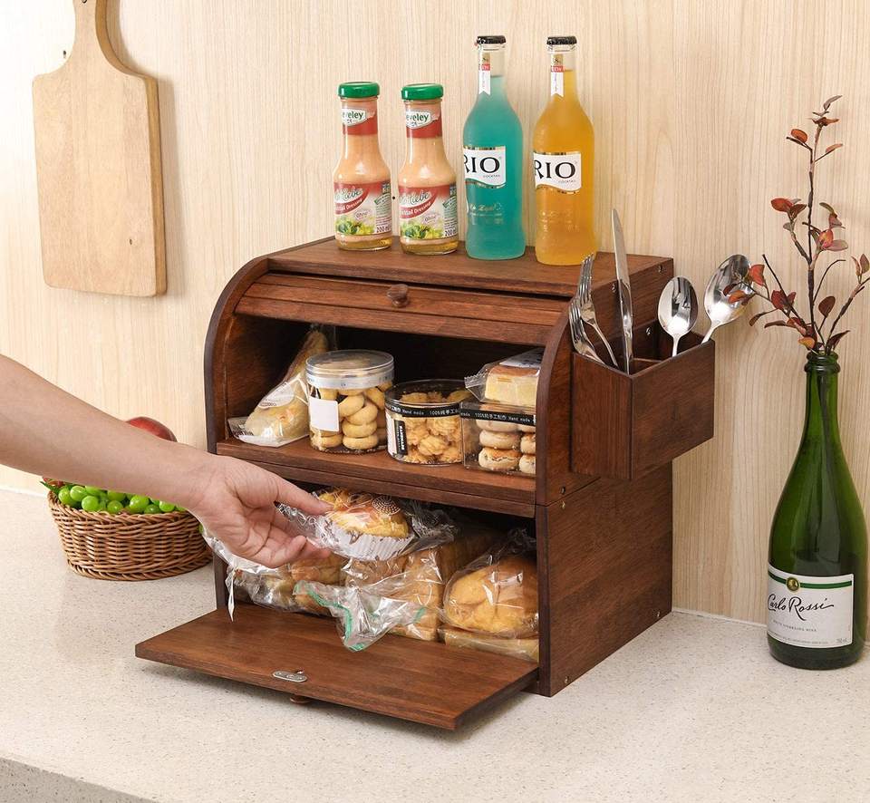 Multi-functional Natural Bamboo 2 Layer Bread Boxes for Kitchen Food Storage Removable Layer Large Capacity Bread Keeper Brown