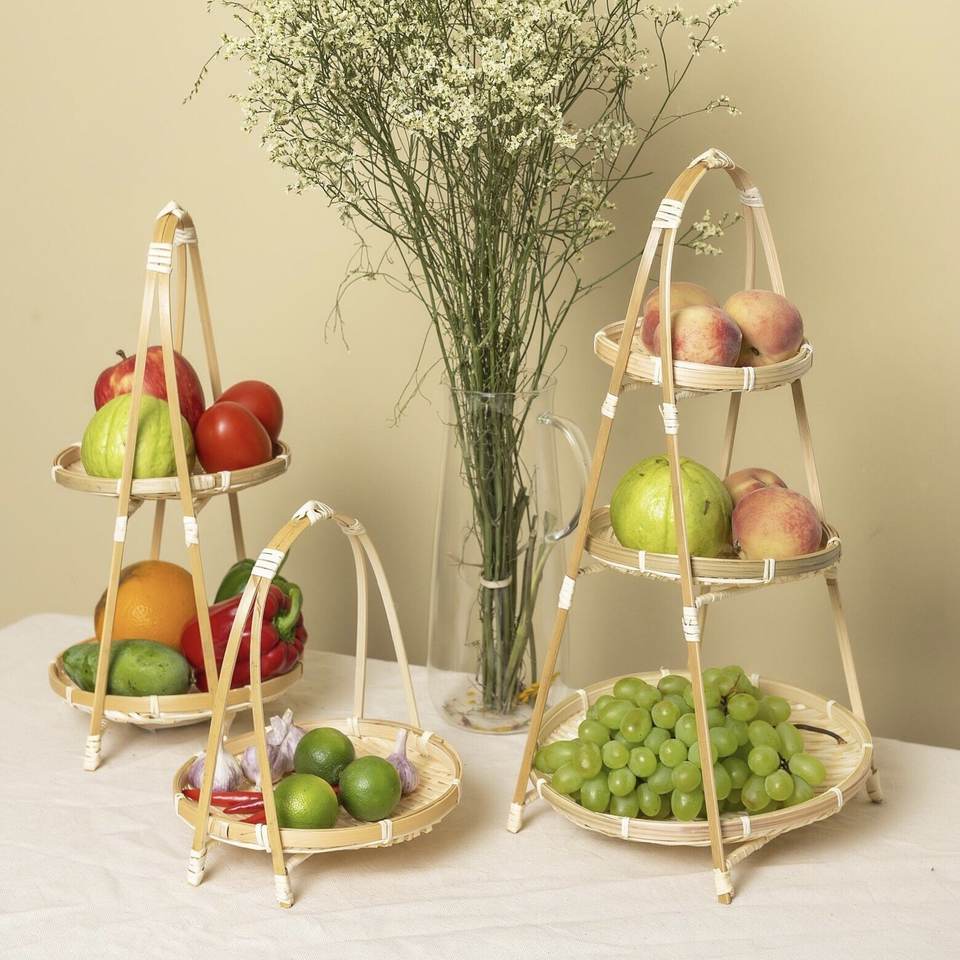 Multi-layer Fruit Storage Tray Rustic Brown Bamboo Weaving Serving Tray Easy Foldable Storage Shelf Rack Home Storage Basket