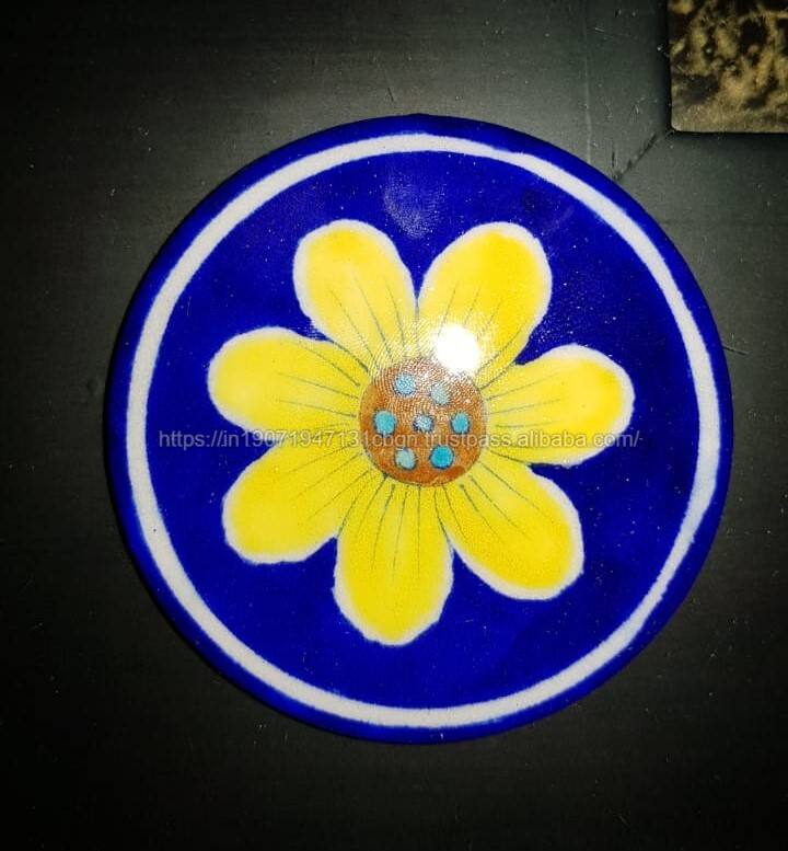 Multicolor Hand-Painted Blue Pottery Coasters Handmade Blue & Yellow Ceramic Round Floral Coaster Set