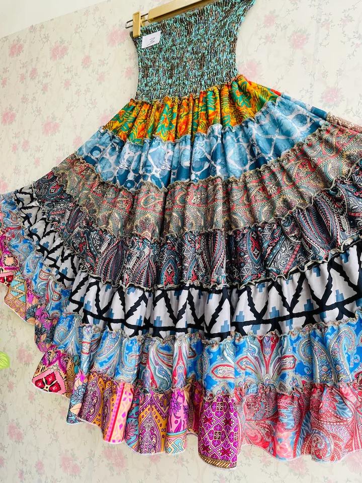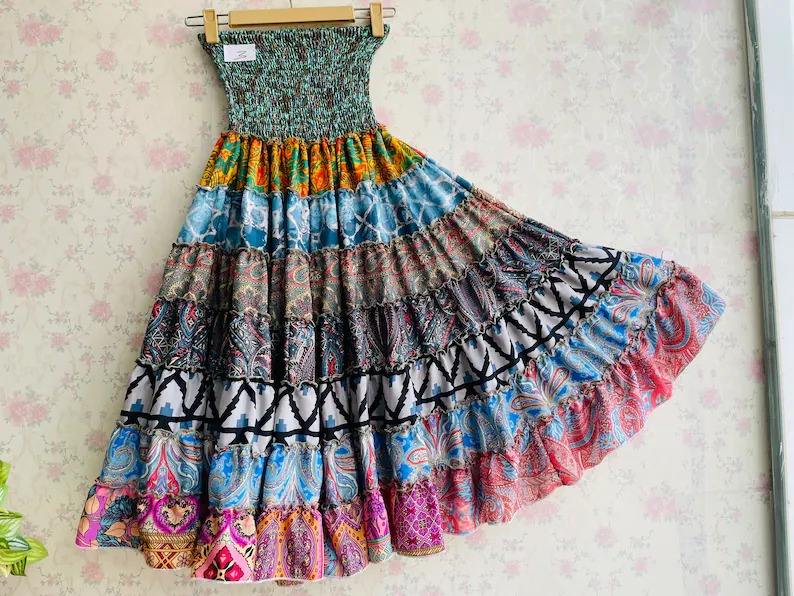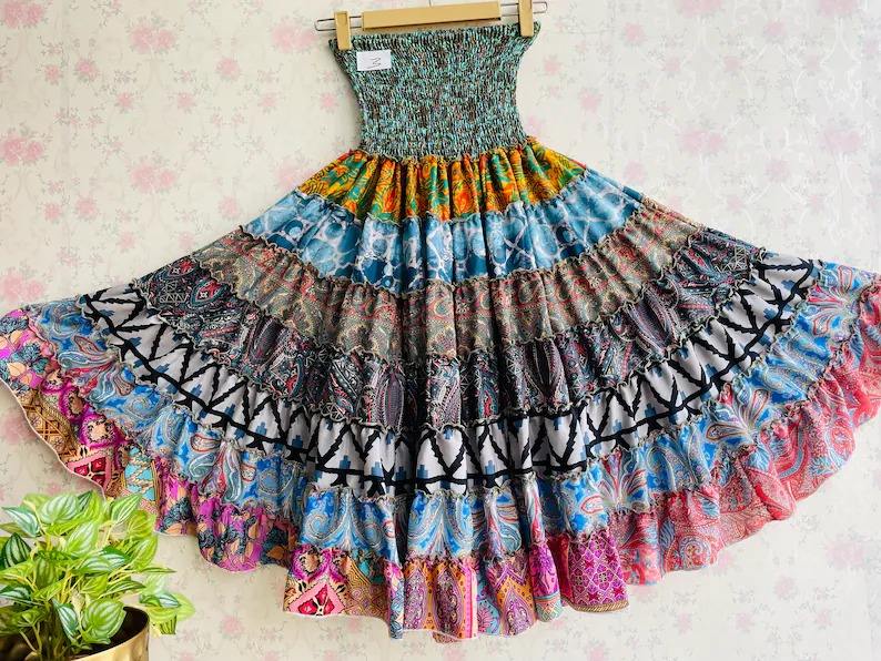 Multicolour Silk Patchwork Skirt Tribal Boho Skirt Folk Long Vintage Skirt Gift for Her Womens Clothing Gypsy Bohemian Tube