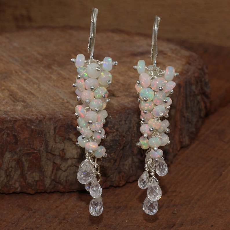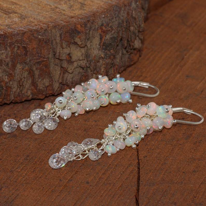 Multifire White Opal Gemstone Beads Cluster Earrings Genuine Opal Beads Silver Earrings Handmade Earrings Gift For Women