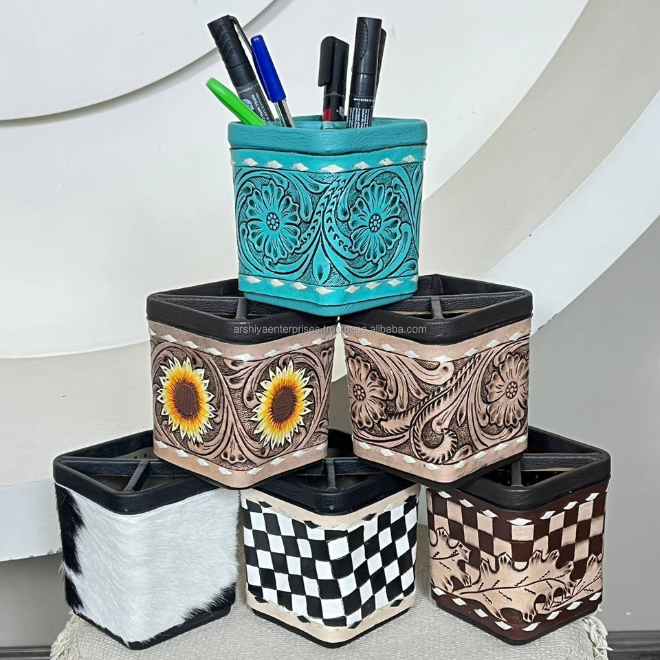 Multifunctional Desktop Storage Pen Holder Hand Tooled Genuine Leather Organizer Pen Stand Pen Holder Pencil Cup Desk Organizers