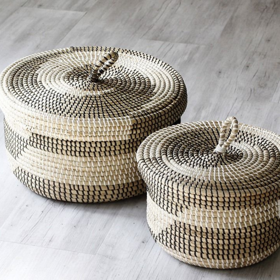 Multifunctional Handwoven Round Seagrass Storage Basket With Plastic String Vietnam Decorative Colorful Rustic Laundry Basket