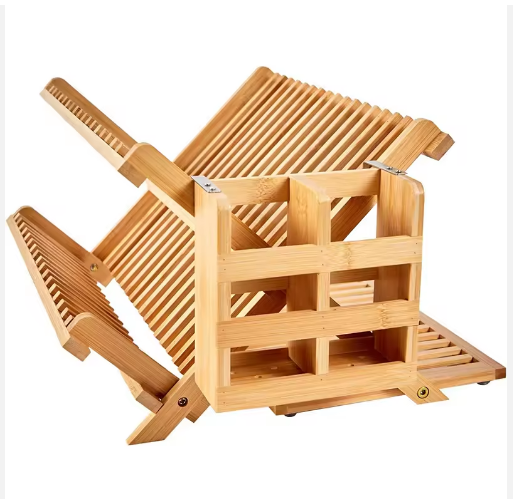 Multifunctional Organizer 3 Tier Collapsible Bamboo Plate Dish Drying Rack Dishes Rack with Utensil Holder for Kitchen Counter