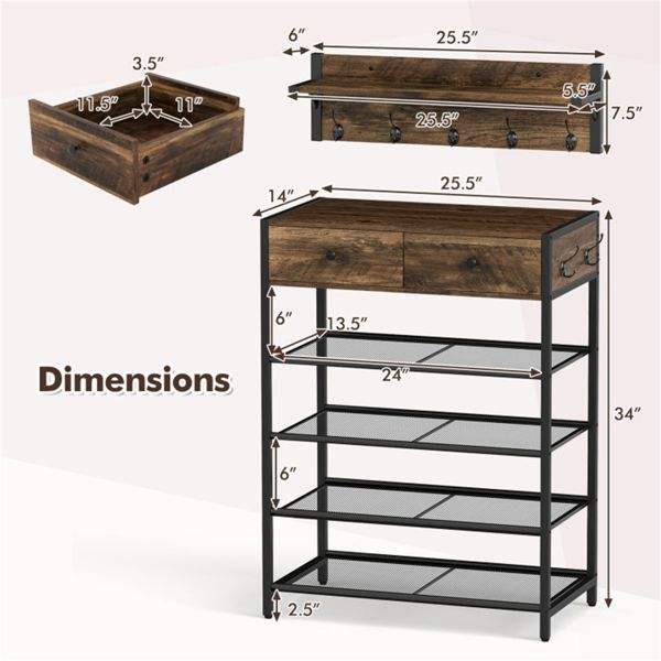 Multifunctional Over Door Storage Rack 5-Hook Coat Rack with 2-Drawer Shoe Stand and 4-Mesh Shelves