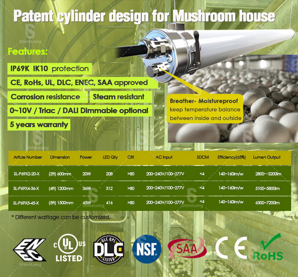 Mushroom Grow House LED Tri-proof Light with UV for Farm and Tent Use IP67 Rated 5-Year Warranty
