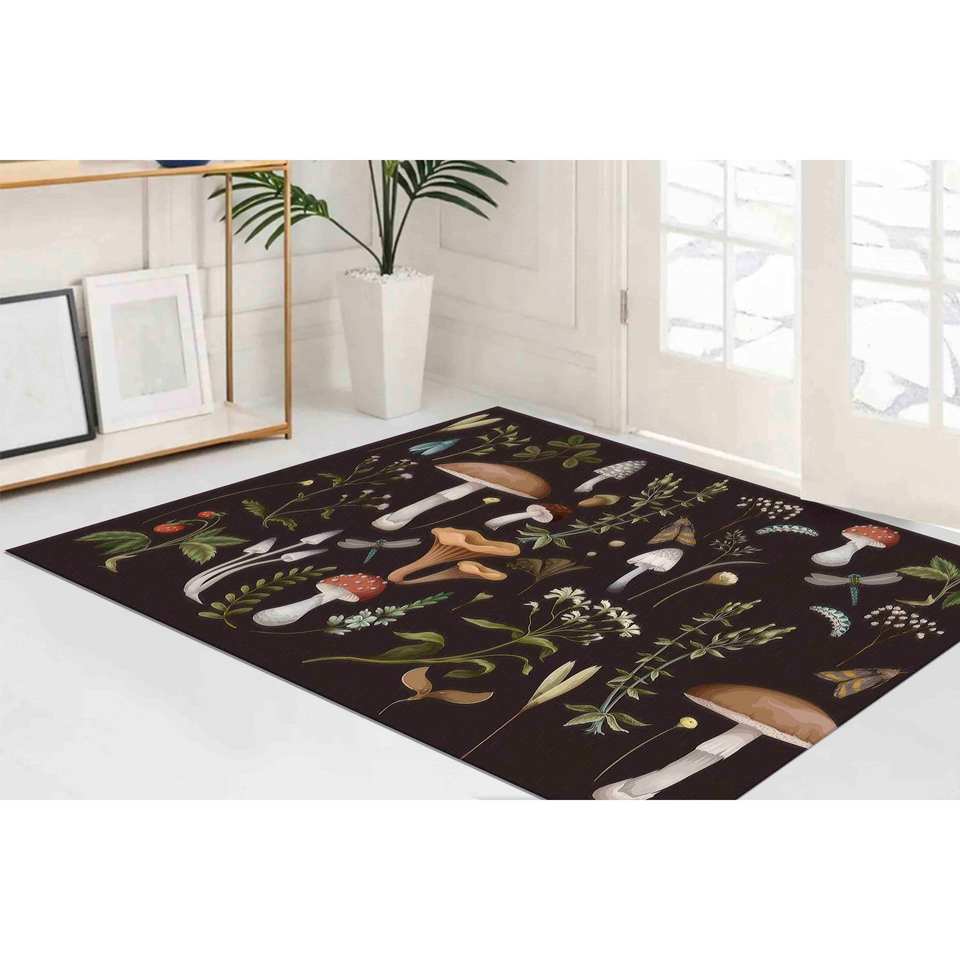 Mushroom Rug: Black Botanical Decor, Pet Friendly Area Rug,With Pile Soft Rug