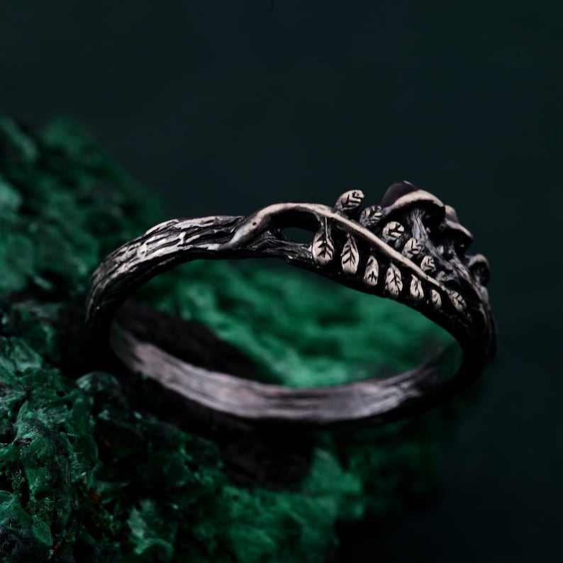 Mushrooms With Leafy Band Ring Nature Inspired Bridal Band Ring Anniversary Promise Ring 925Silver Dainty Ring Nature Lover Ring