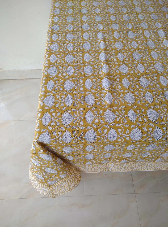 Mustard Floral 100% Cotton Handmade Indian Style Tablecloth Hand Block Printed Custom Size Rectangle Home Hotel Wedding Party