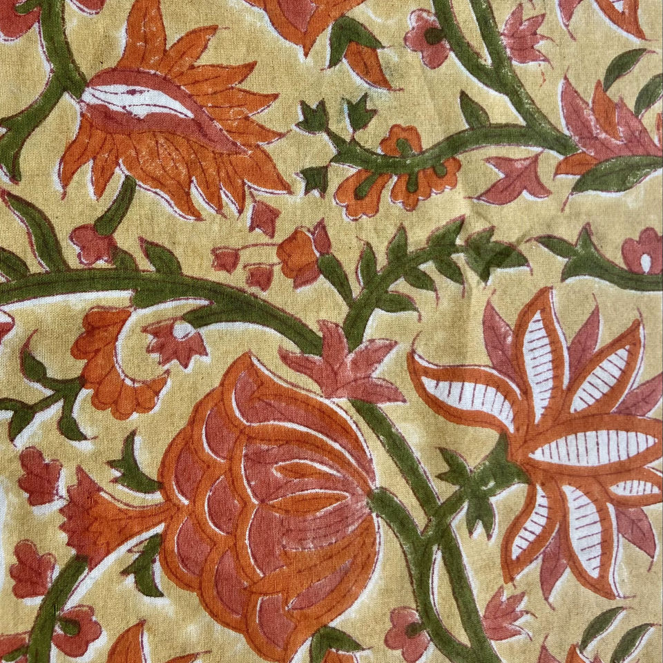 Mustard Yellow Hand Block Printed Cotton Fabric Orange Floral Vine Design