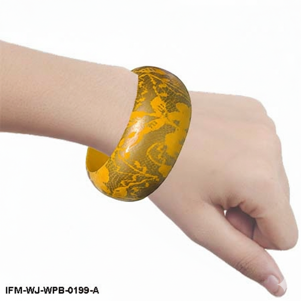 Mustard Yellow Hand-Painted Wooden Bangle Floral Lace Pattern Chunky Wood Bracelet for Women Bohemian Statement Jewelry