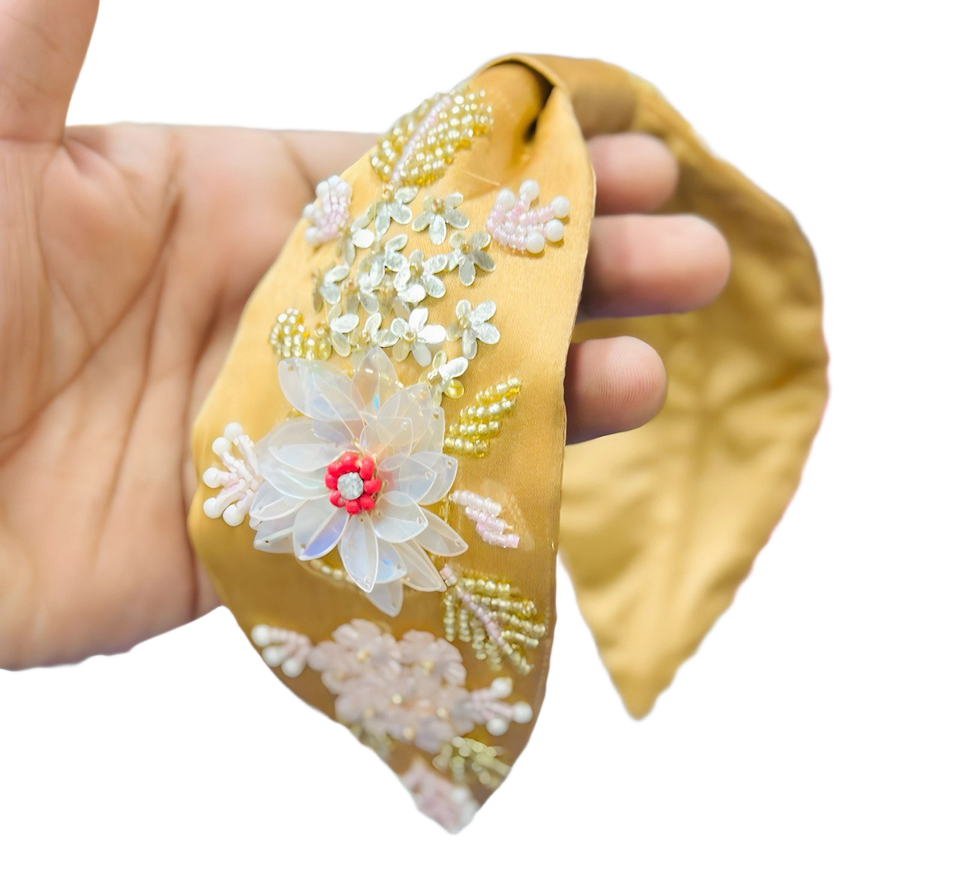 Mustard Yellow Handmade Eco-Friendly Durable 14CM Unisex Headband 3D Floral Embroidery Beaded Sequin Detailing Knotted Padded