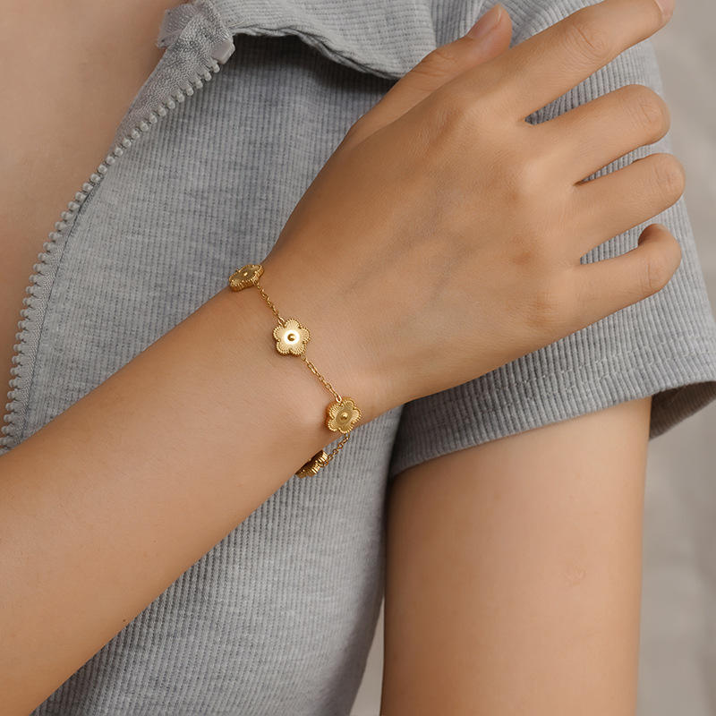 Muyama Women's Trendy Gold Five-Leaf Clover Bangle Mother-of-Pearl Crafted Fadeless Titanium Steel for Daily Use Anniversary