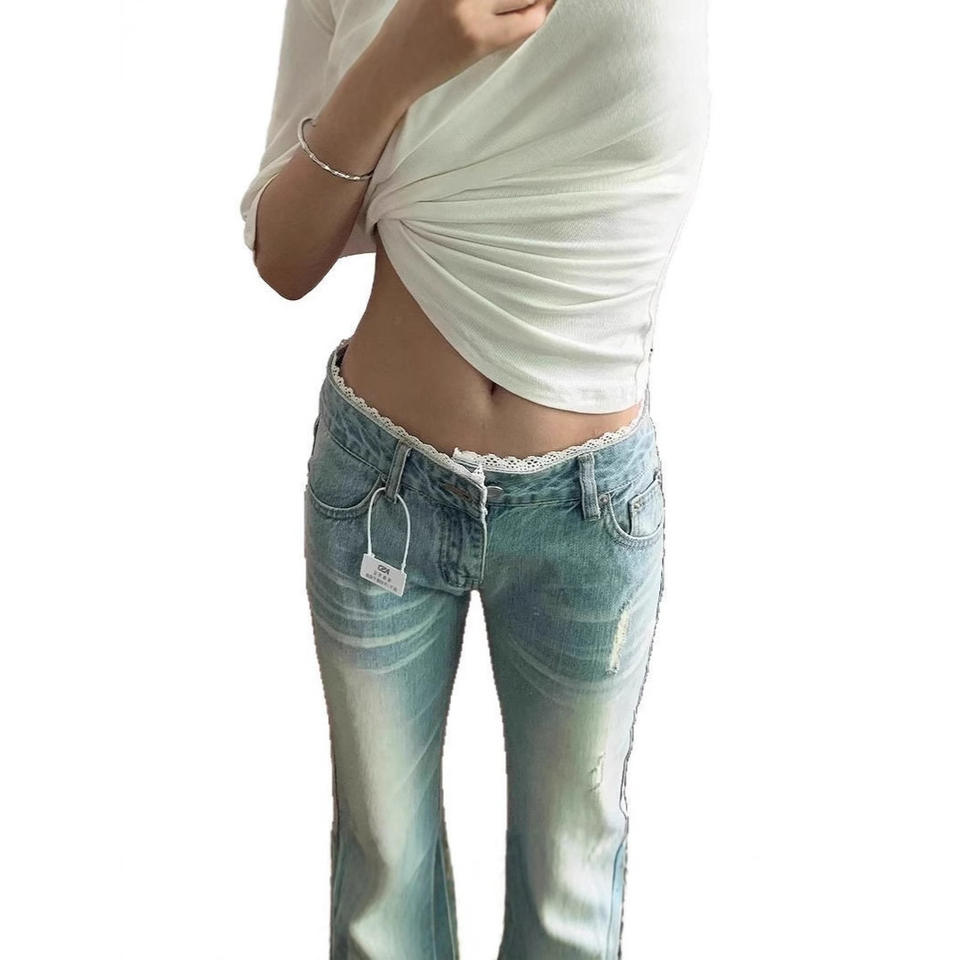Muzi Nana 2025 New Women's Flared Jeans Blue Ripped Low Waist Slim Fit Bow Breathable Skinny Trousers for Spring Summer