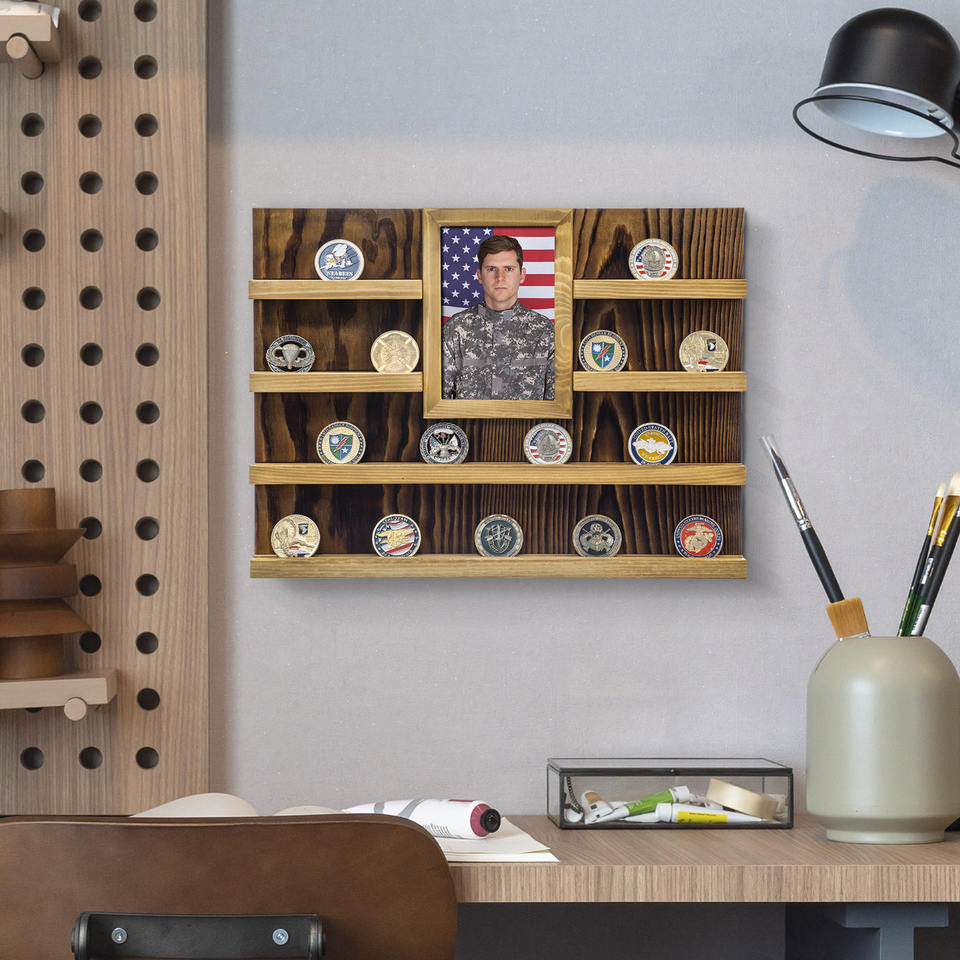 MyGift Rustic Burnt Wood 4-Tier Challenge Coin Display Shelf - Wall Mounted Medal Organizer, Top Seller