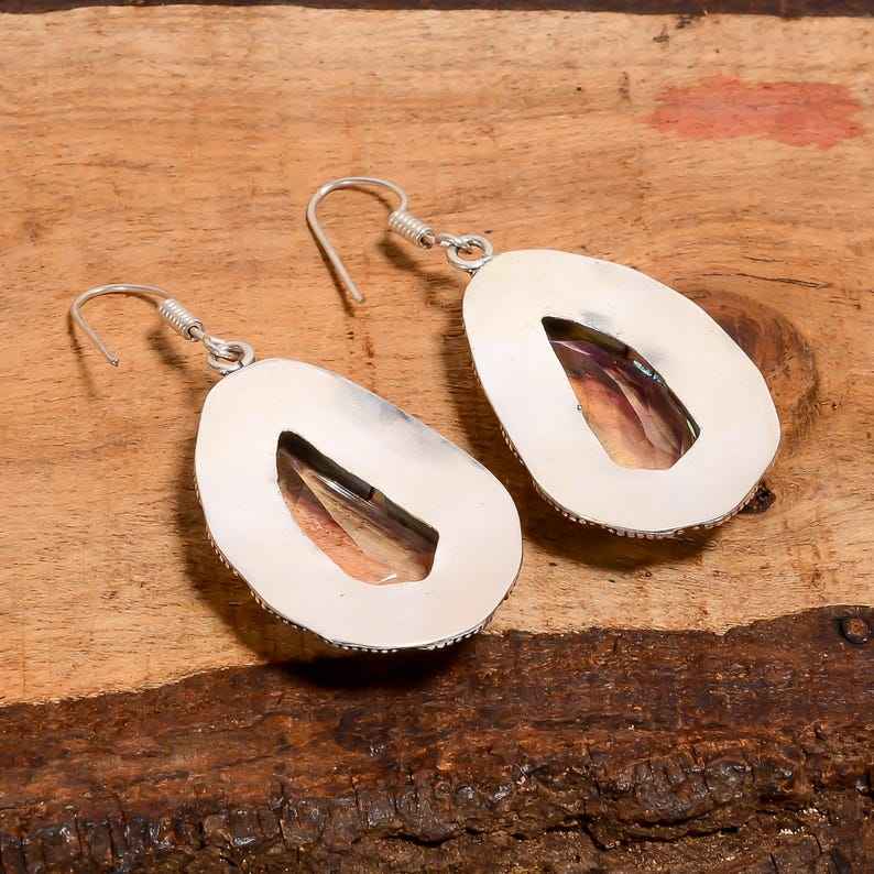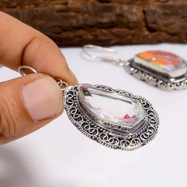 Mystic Fire Quartz Silver Dangle Earrings Vintage Style 925 Sterling Silver Bohemian Handmade Jewelry Gift
