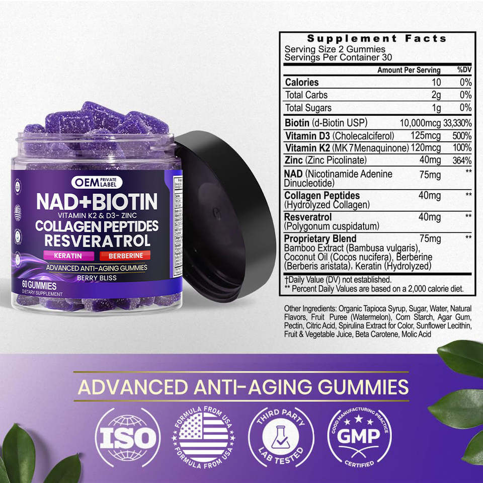 NAD+ Resveratrol Berberine Biotin Anti-Aging Gummy Collagen Keratin Zinc Vitamin K2 & D3 NAD Gummies for Hair, Skin, Nails Joint