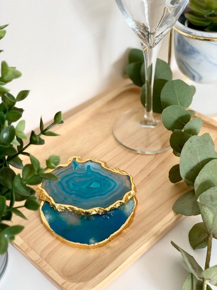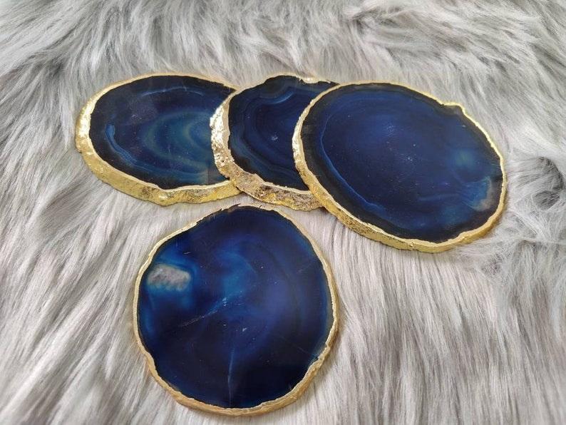 NATURAL BLUE AGATE COSTER WITH GOLD TRIM/POLISHED AGATE COSTER/PREMIUM QUALITY BLUE AGATE COSTER WHOLESALER;