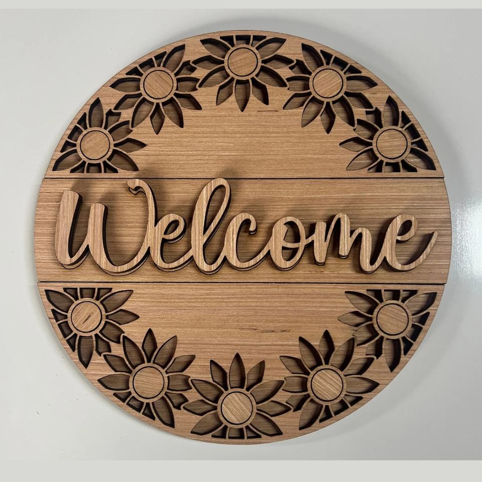 NEW DESIGN! Welcome Round Sunflower Wreath Door Hanger Oak Wood, Door Hanger DiY, Paintable Hanging Decorations for Home Hotel
